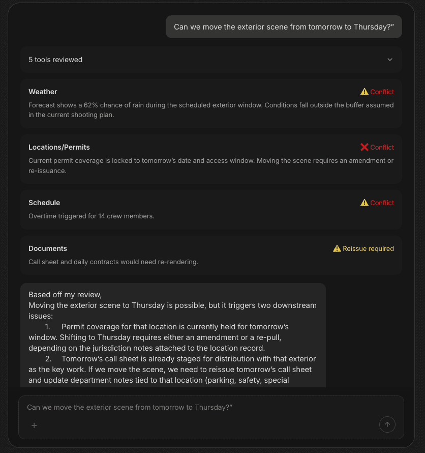 The AI understands union requirements, labor rules, contract terms, and compliance constraints. It flags issues early and helps you stay audit-ready as production evolves.