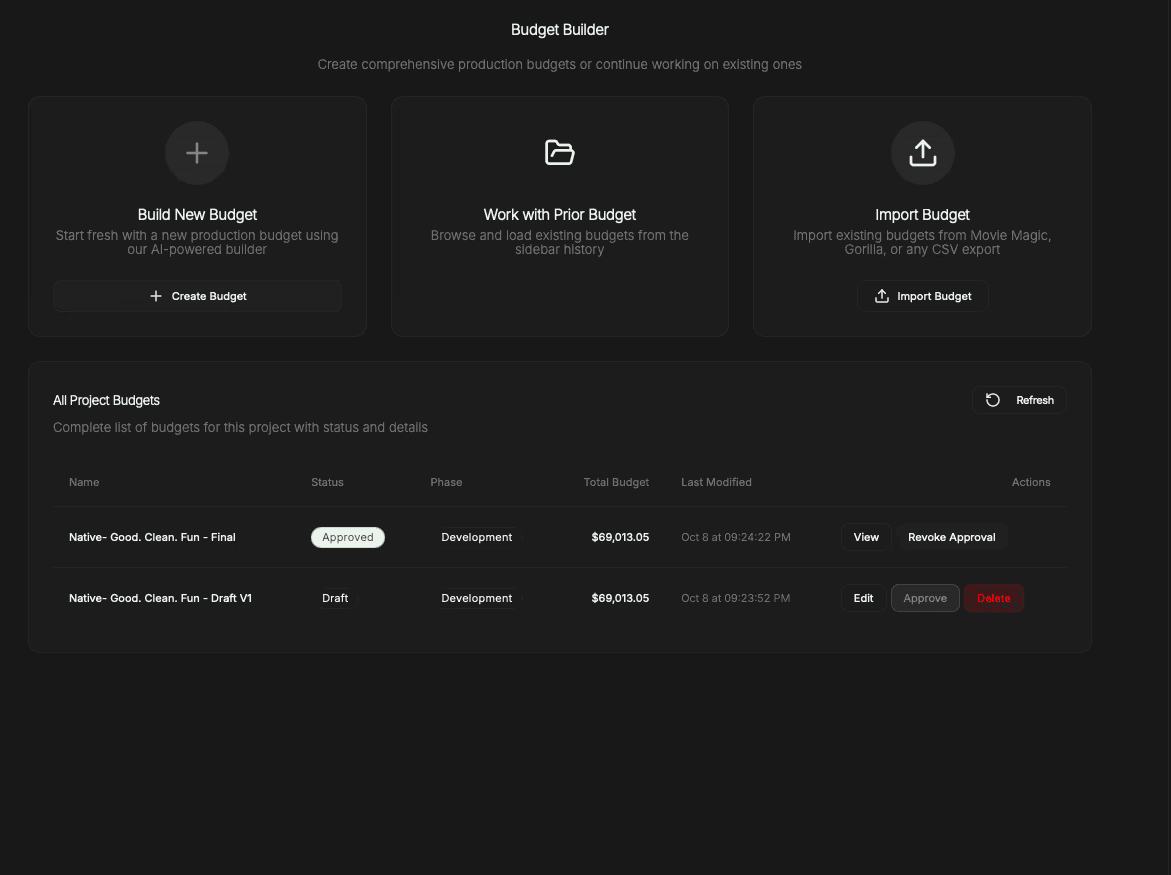 Create draft budgets that reflect real production structure—by department, role, and phase. Duplicate, adjust, and version budgets without overwriting prior work, so comparisons stay intact as plans evolve.
