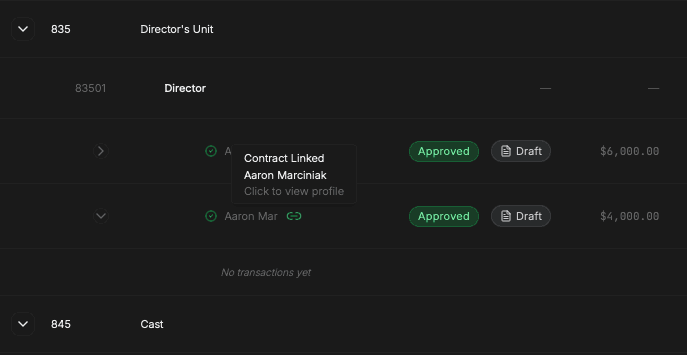 Budget line items can be linked to departments, roster positions, and contracts. This creates continuity between financial intent and operational reality—so spend, labor, and approvals remain synchronized throughout production.