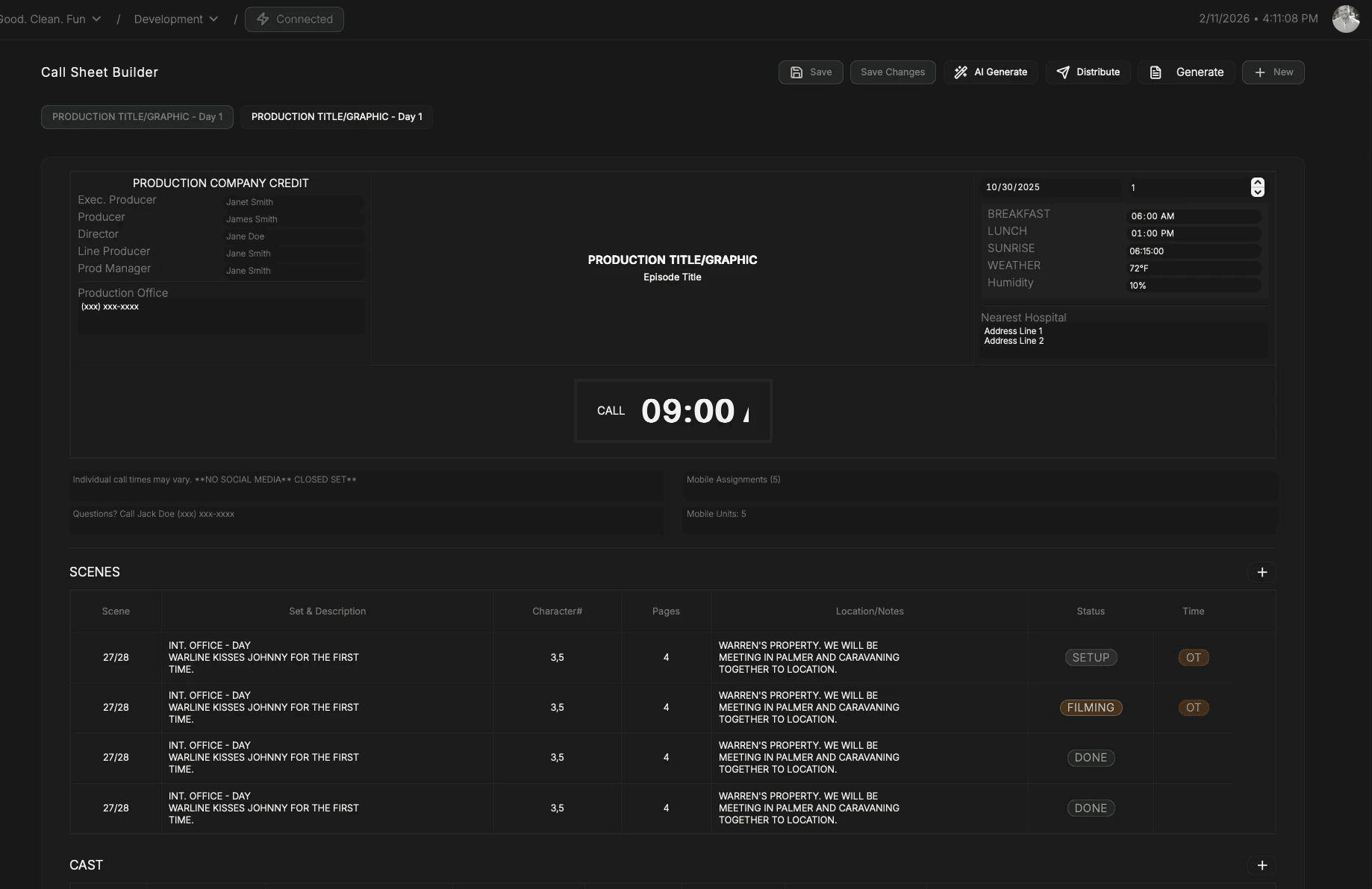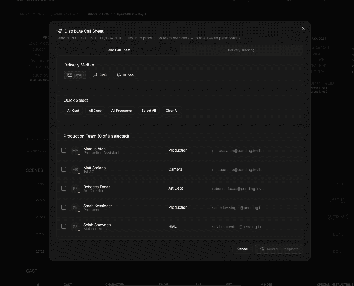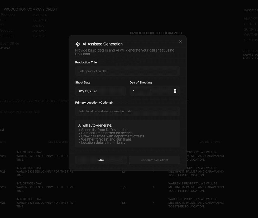 Callsheets are assembled using scenes, locations, cast, and crew already defined in the production. When the schedule or roster updates, those changes are reflected inside the builder. Call sheets are constructed from the production itself — not from copied information.