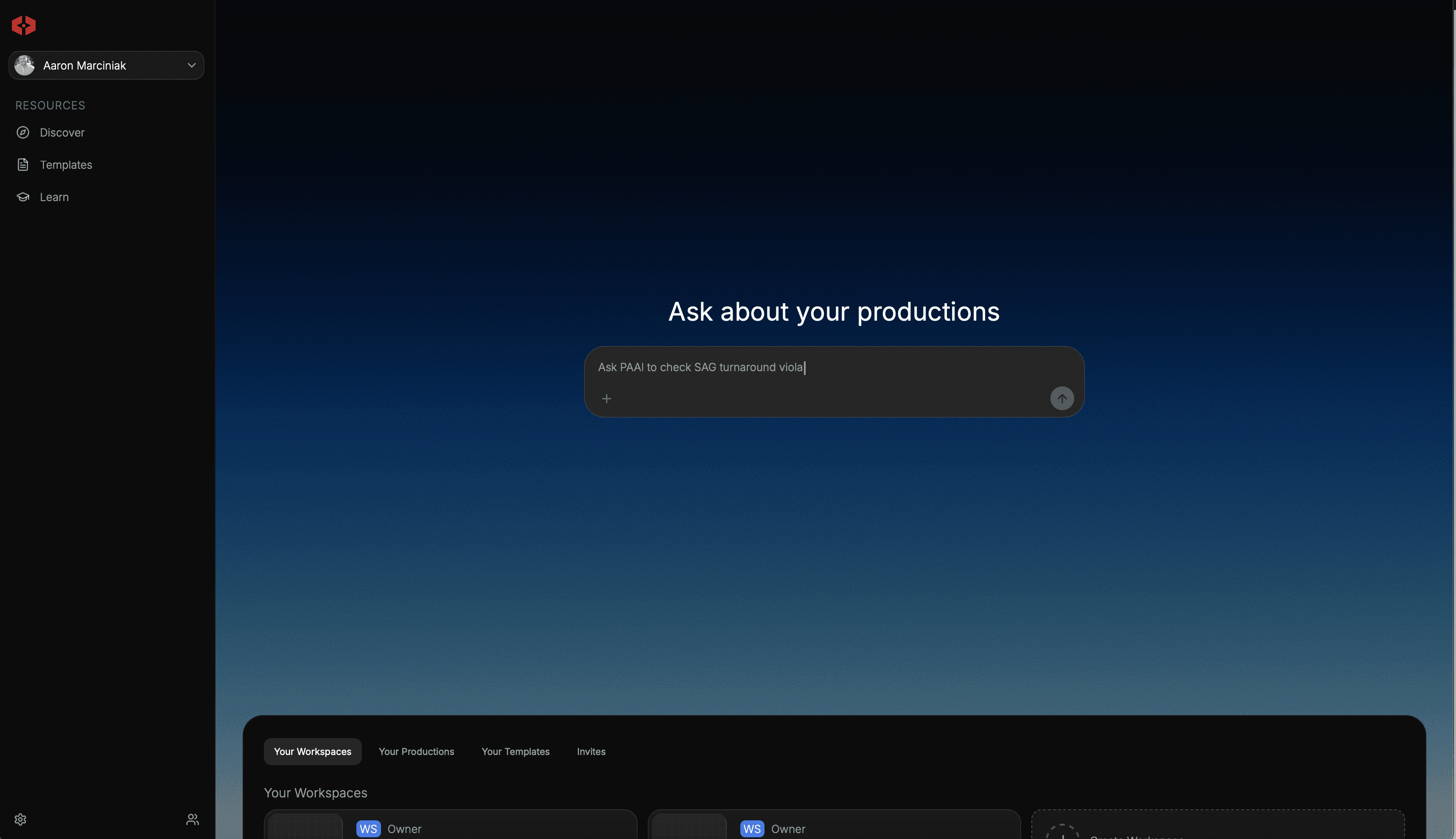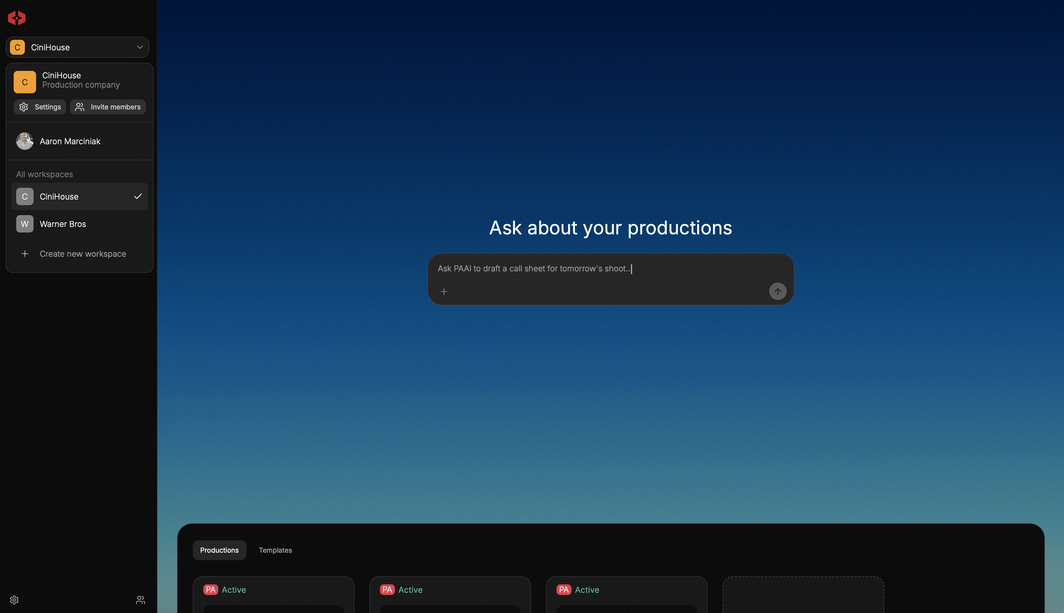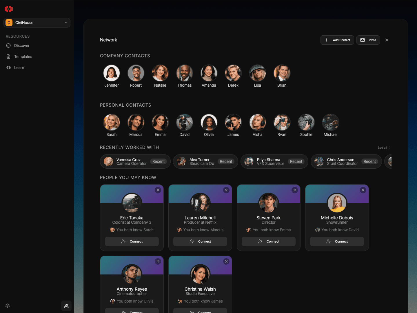 The personal workspace anchors individual ownership inside the system. Private templates, personal contacts, and production invitations live independently from company or project structures. Nothing becomes collaborative unless intentionally connected.