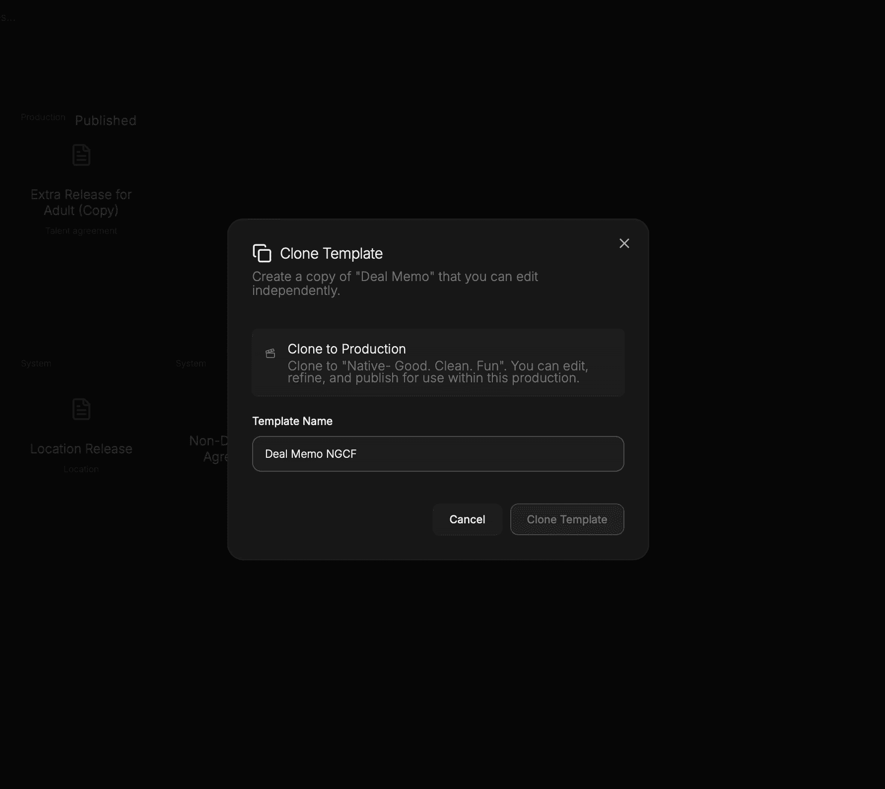 Each production runs inside its own contained workspace. Budgets, contracts, teams, documents, and records remain attached to the production that owns them. Templates must be cloned before use, ensuring changes never ripple backward or sideways into unrelated work.
